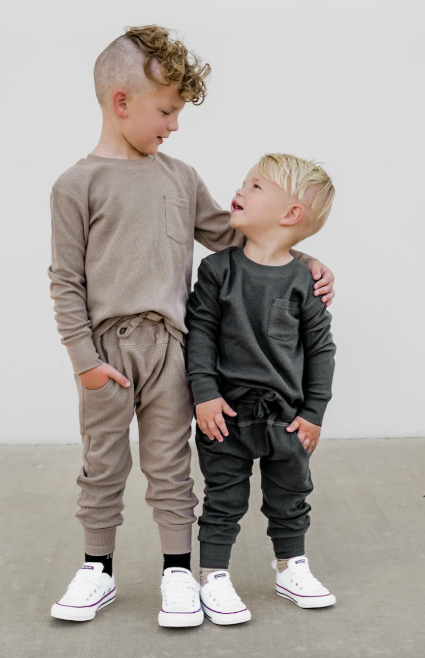 Little Bipsy's signature Waffle is back! Available in Shadow and Mushroom, this cozy long-sleeve top offers the perfect balance of comfort and style. Crafted from soft, breathable fabric, it's designed to keep your little one cozy all season long. Available in sizes from 6-12M to 5/6T, it’s a versatile staple for layering or wearing solo. Pair with our matching joggers for a complete look!