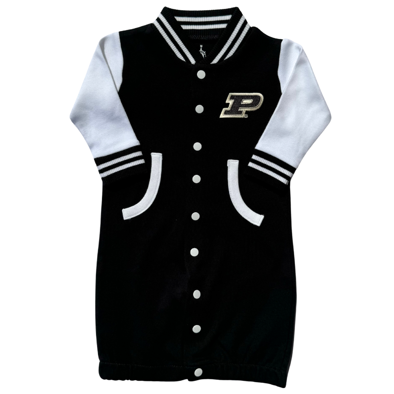 Designed just like the baby/toddler/kids varsity jacket - this convertible romper style is made especially for newborns. It can be a romper or a gown, with an adjustable snap closure.