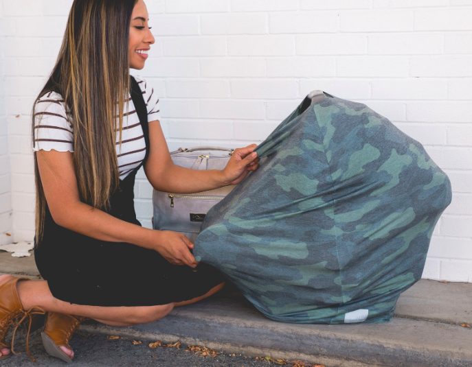 - Stretchy fabric fits most all car seats, shopping carts, high chairs and nursing mothers. It can also be a trendy infinity scarf! Dark grey fabric is gender neutral and trendy