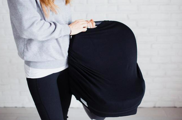 - Stretchy fabric fits most all car seats, shopping carts, high chairs and nursing mothers. It can also be a trendy infinity scarf! Dark grey fabric is gender neutral and trendy