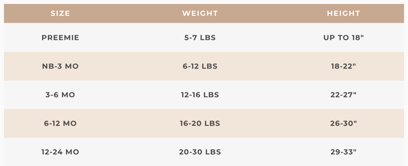 Newborn-3 Month: 6-12 pounds // 18-22” long