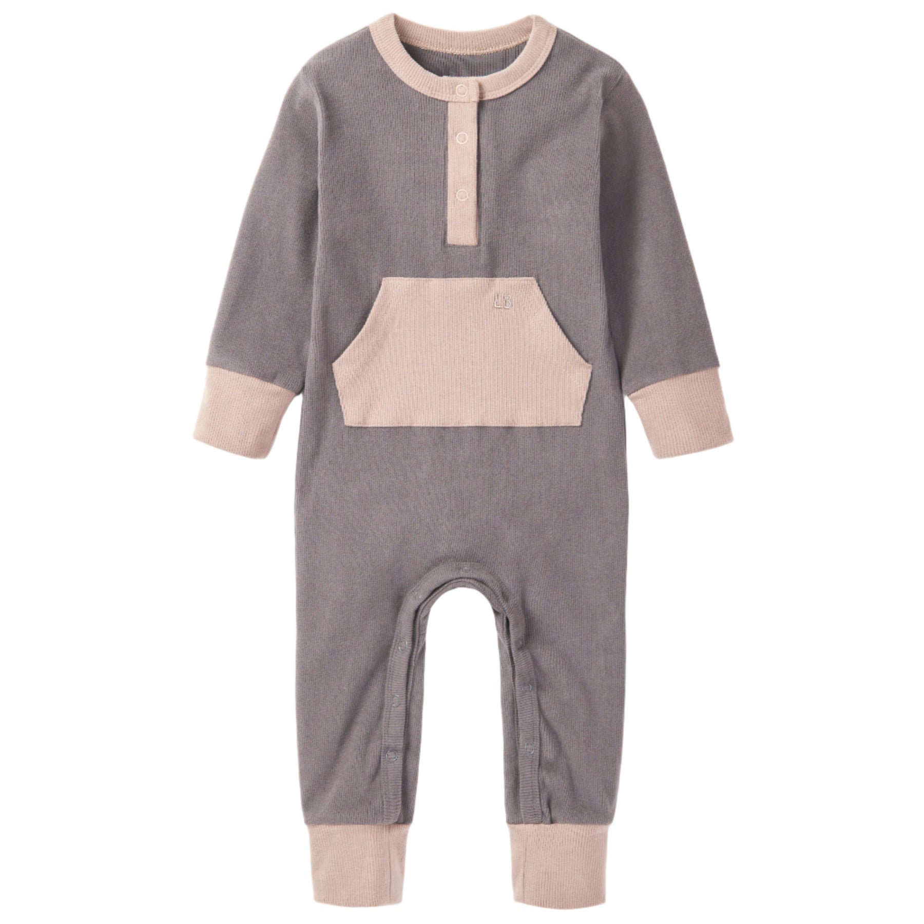 Cozy meets cool in this colorblock baby favorite. Made with Little Bipsy's soft ribbed fabric in graphite with subtle mushroom accents, this romper is designed for all-day comfort and easy movement. Ribbed wrist + ankle cuffs keep the fit snug, while inner snaps make diaper changes a breeze. Finished with a front kangaroo pocket and our signature embroidered “LB” for that classic Little Bipsy touch.
