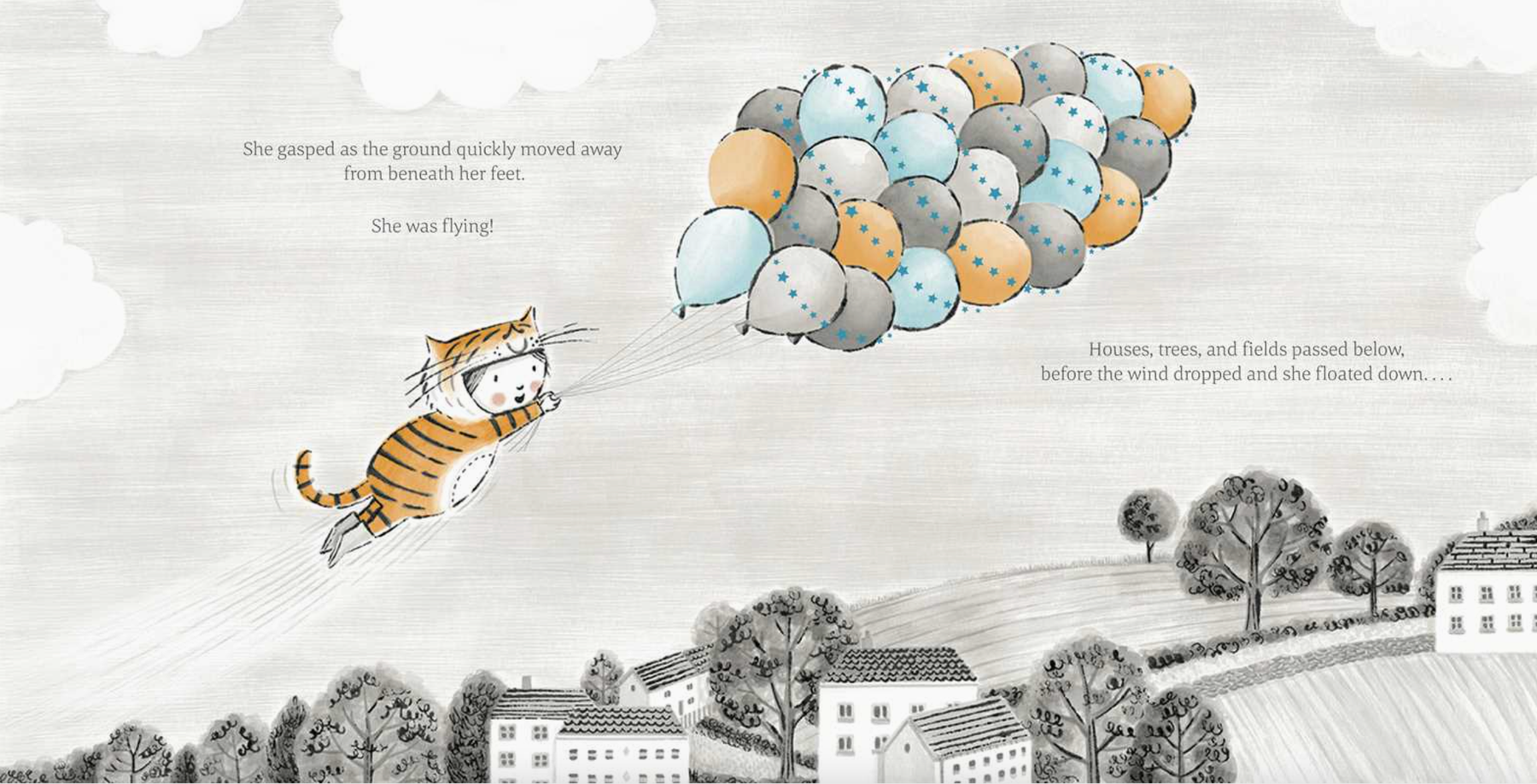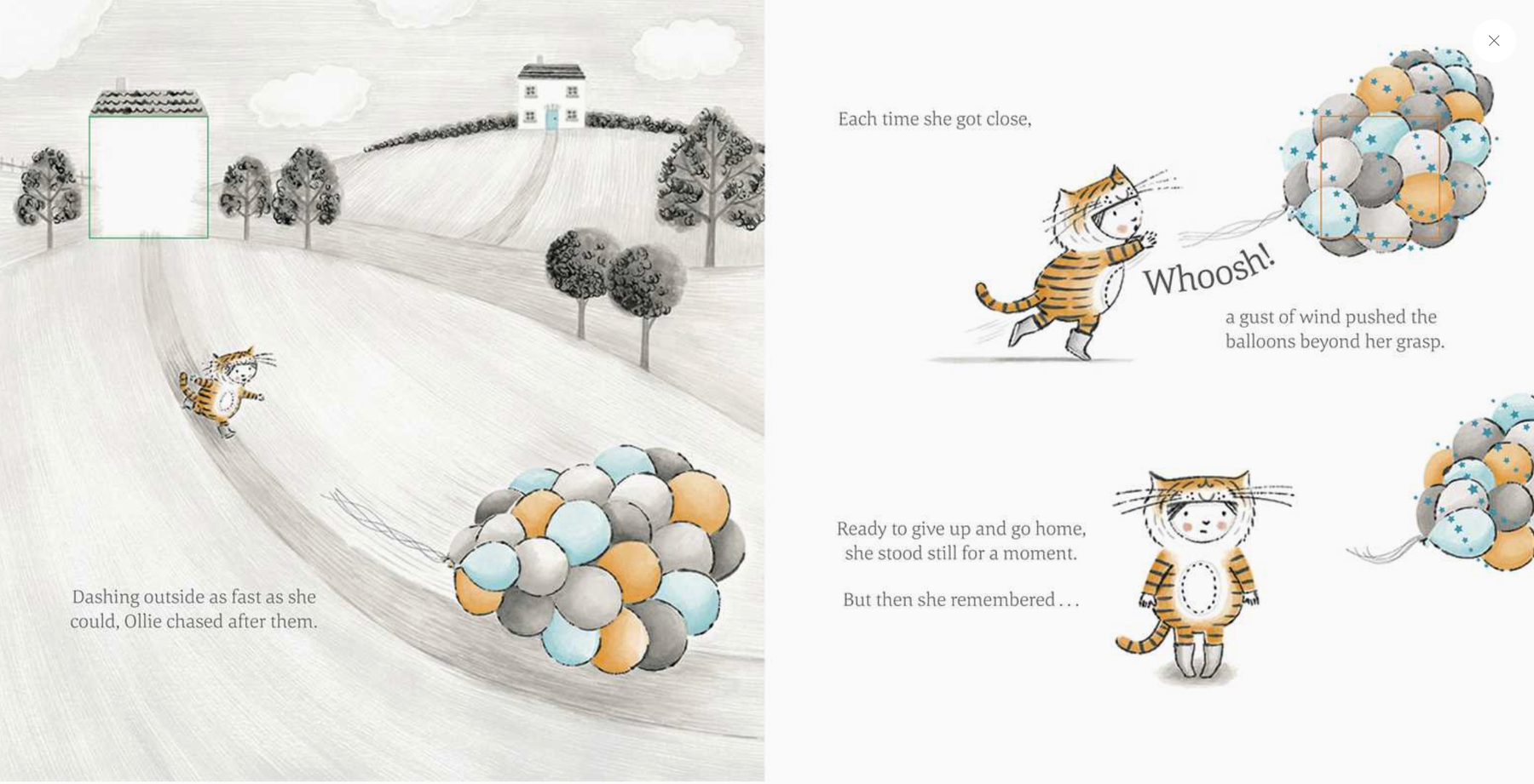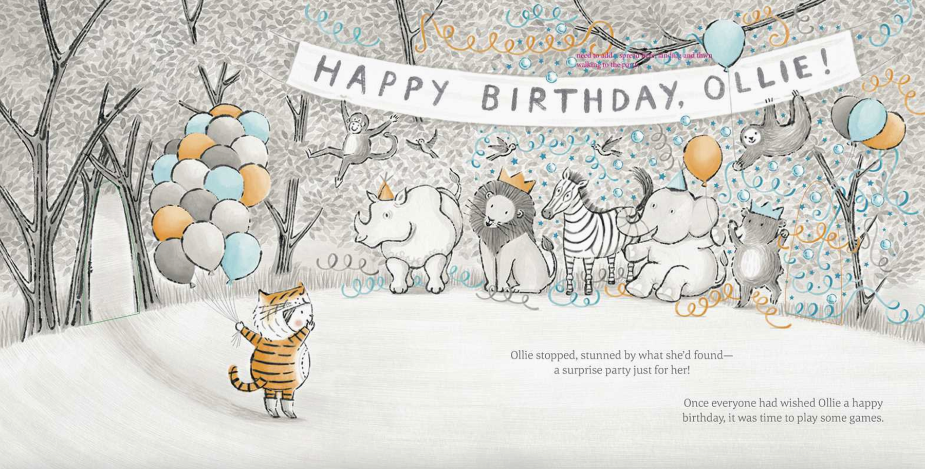 For Ollie’s birthday, her wish came true! In a brightly wrapped box was her very own tiger suit. Ollie practices her very best Rooooaaarrrr, then a bunch of colorful balloons and a gust of wind carry Ollie to the forest where she makes new animal friends. Elephant, Monkey, Sloth, Rhinoceros, Zebra, and Lion help make the most wonderful birthday party for their new friend.