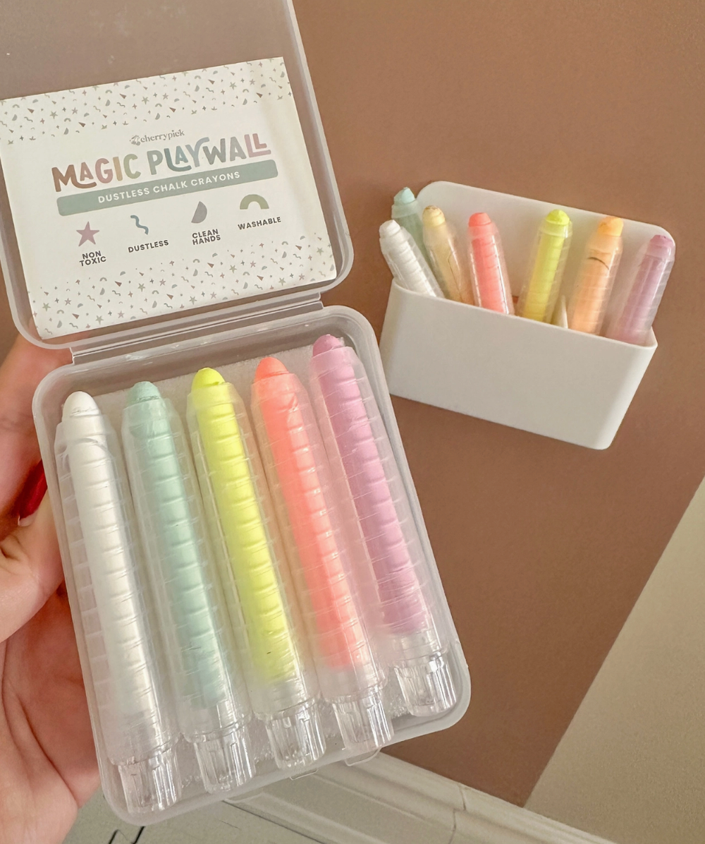 Introducing new playful accessories, designed to complement your Magic Playwall perfectly! This bundle includes one magnetic holder and one set of dustless chalk crayons (5 pcs). Dustless Chalk Crayons